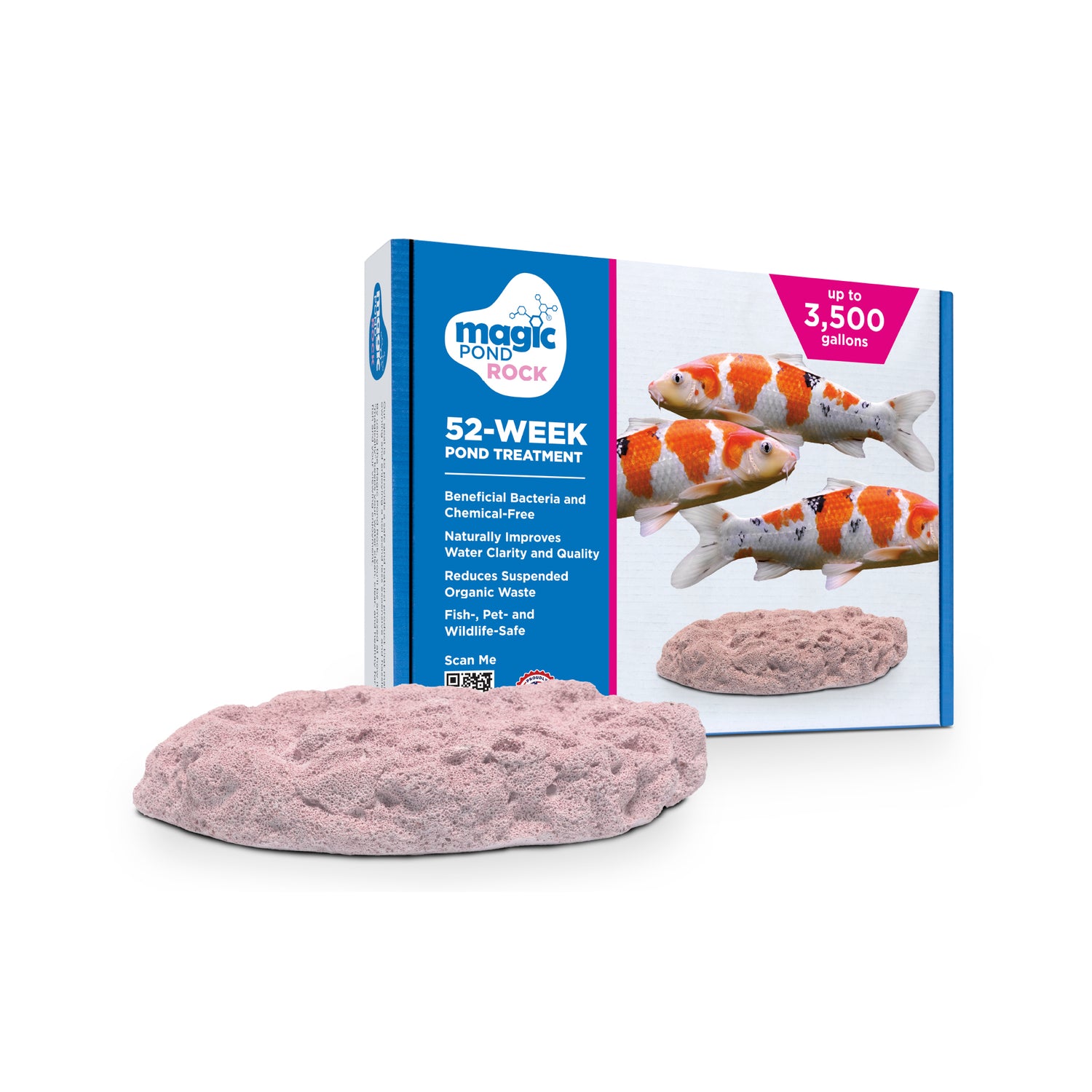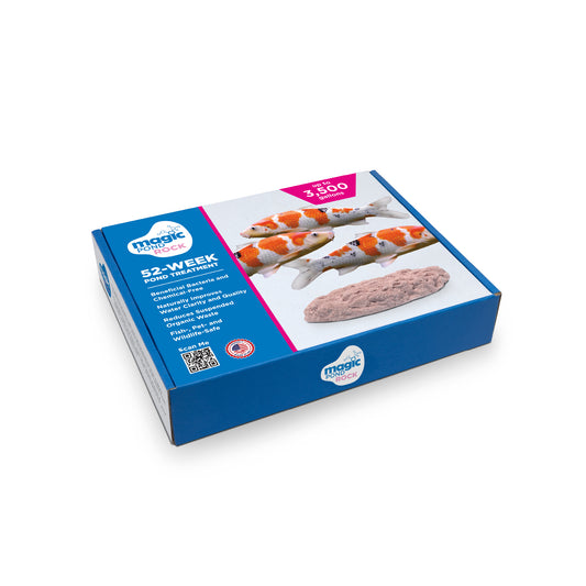 To ensure maximum efficacy, check the Magic Pond Rock every month to make sure it is not clogged with debris, such as leaves, from the pond. If it becomes clogged, simply remove your Magic Pond Rock and gently clear away the debris by hand or with a soft bristle brush. Magic Pond Rock can chip and crack if scrubbed too vigorously, but this will not interfere with it's ability to work. However, do not let Magic Pond Rock freeze, as that can cause the rock to disintegrate and reduce its effectiveness.